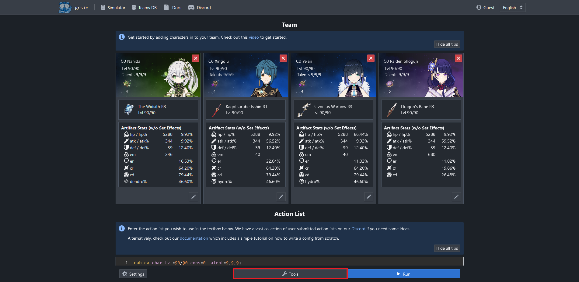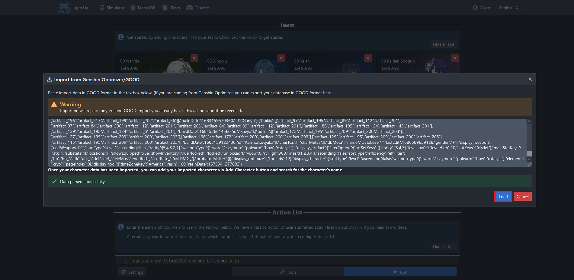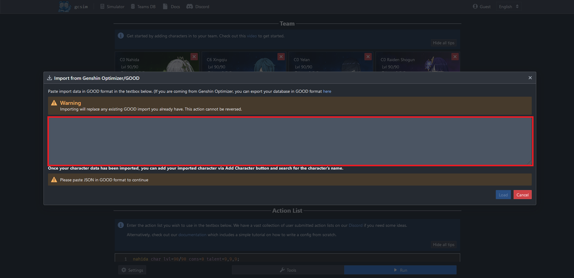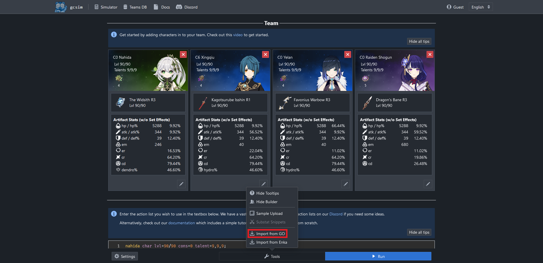 Simulatorpage on gcsim. - Paste your artifact DB into the text box.