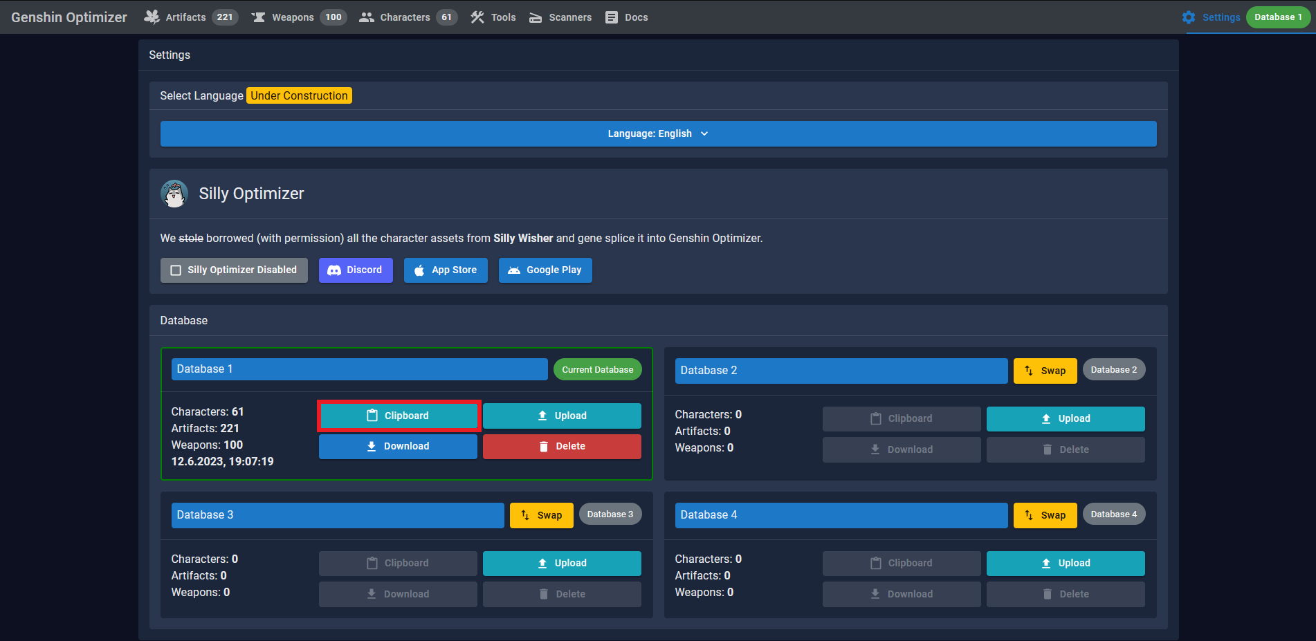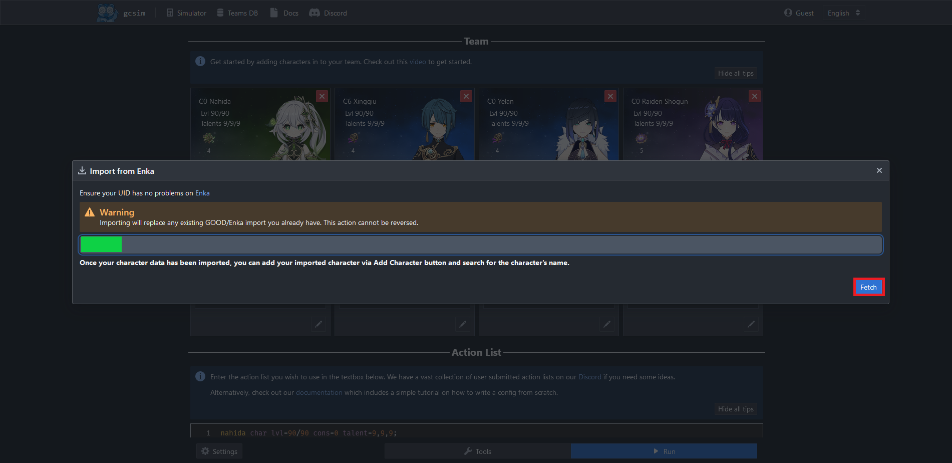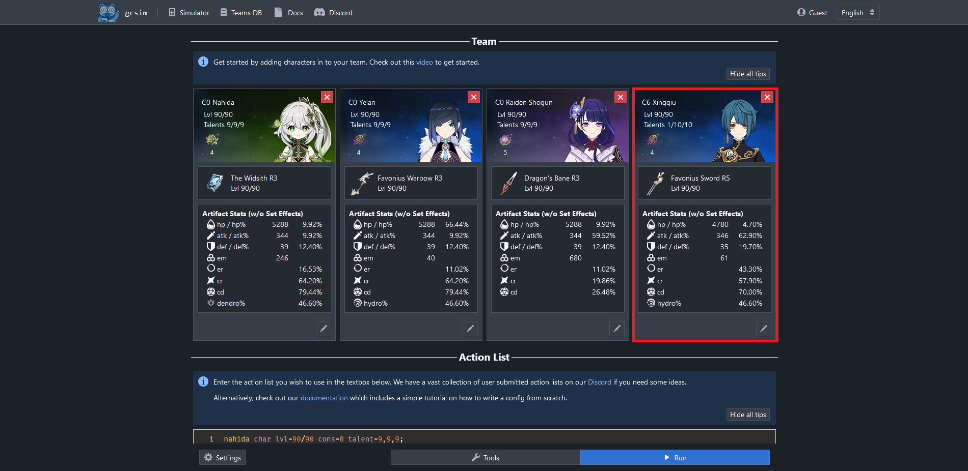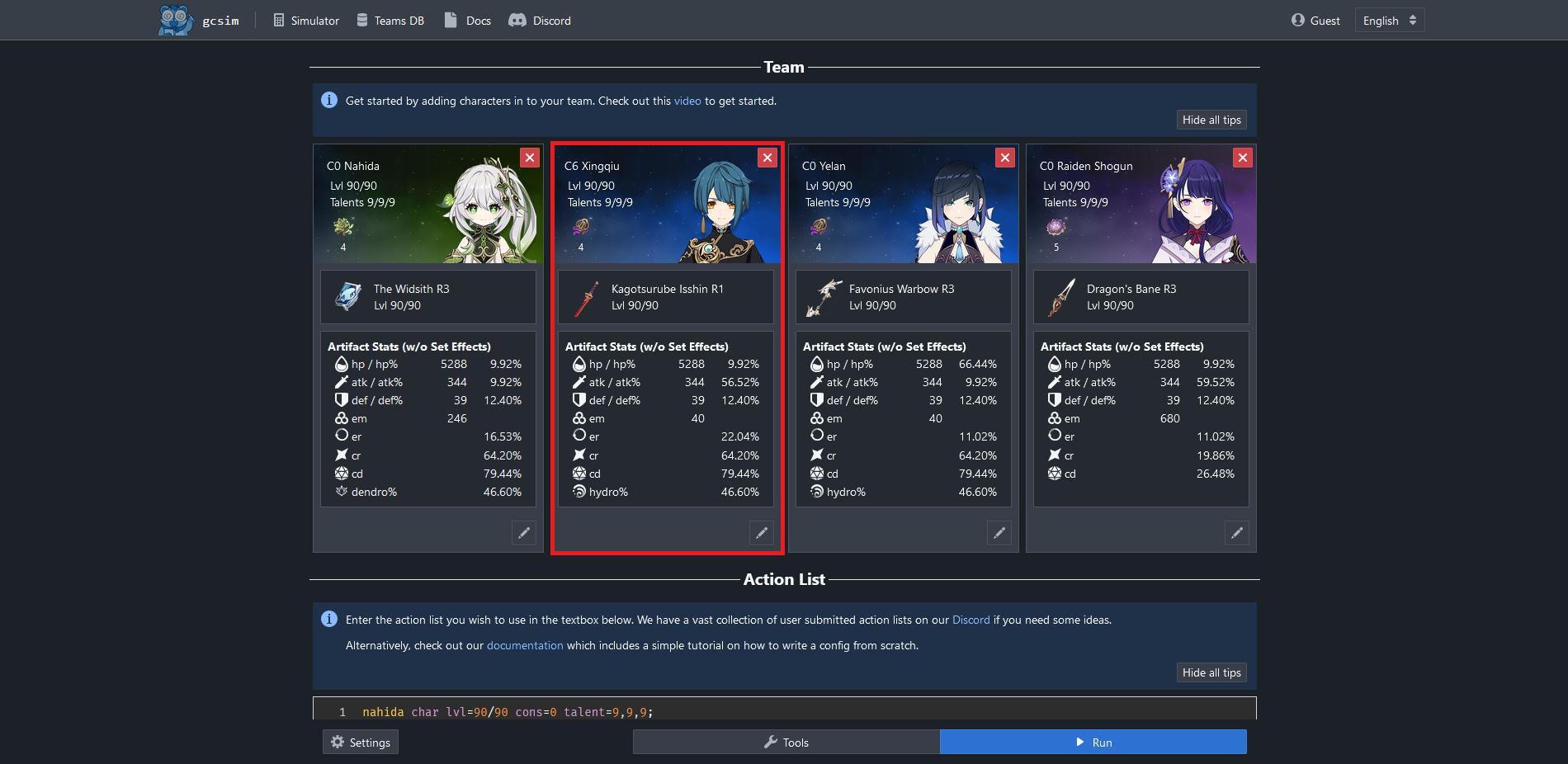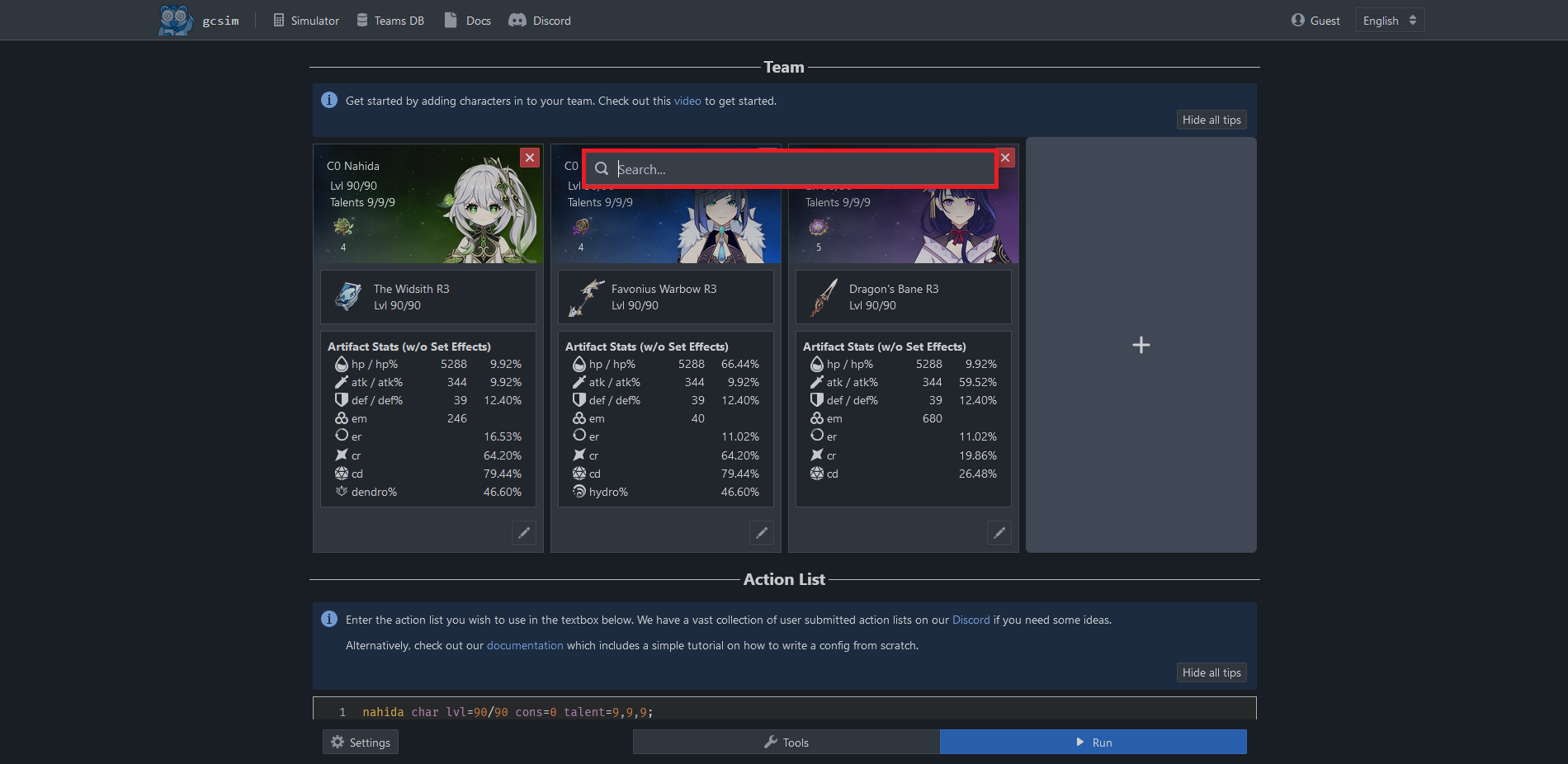Simulatorpage on gcsim. - Paste your artifact DB into the text box.